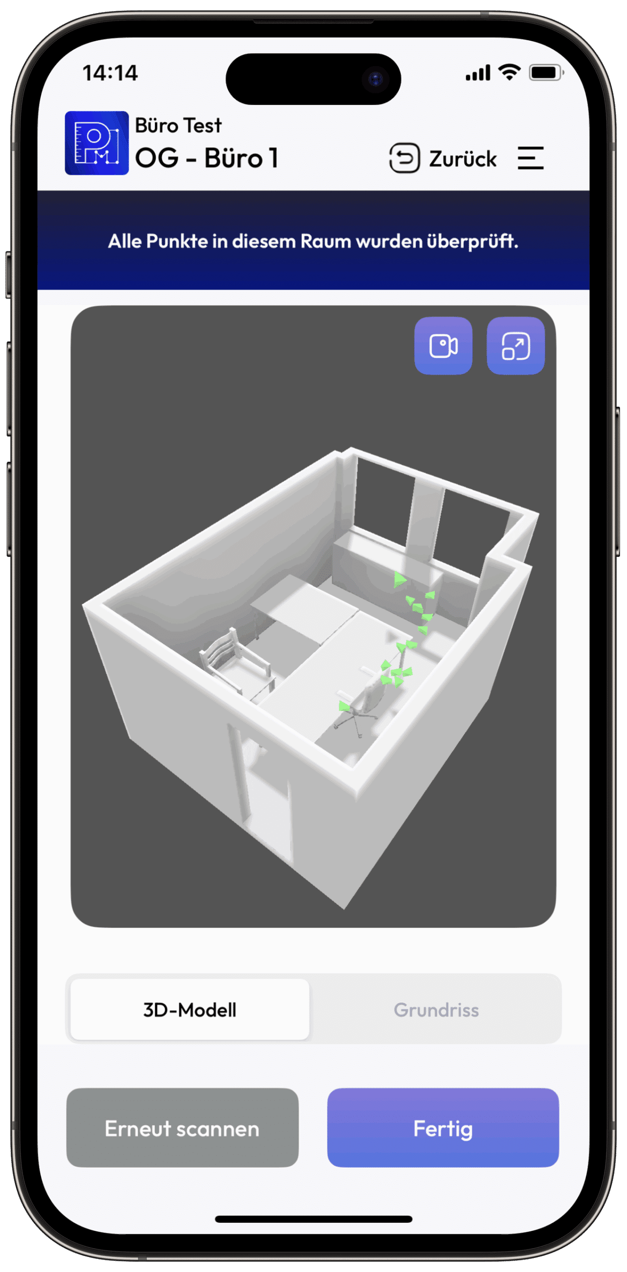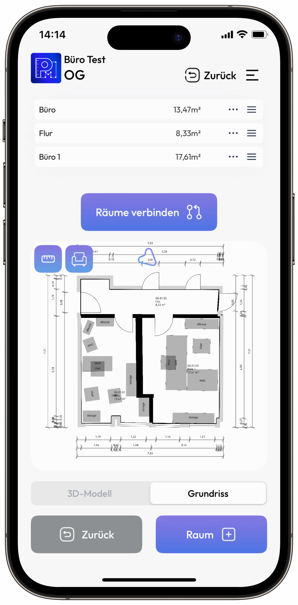 Es gibt keine festen Vorgaben zur Gebäudegröße oder Raumzahl. Jedoch kann bei sehr großen oder komplexen Gebäuden die App-Performance beeinträchtigt sein. In solchen Fällen empfehlen wir, die Vermessung in mehreren Schritten durchzuführen. Aktuell ist die Begrenzung bei etwa 180 m² Fläche. Optimal sind 5 bis 7 Räume auf einer Ebene.